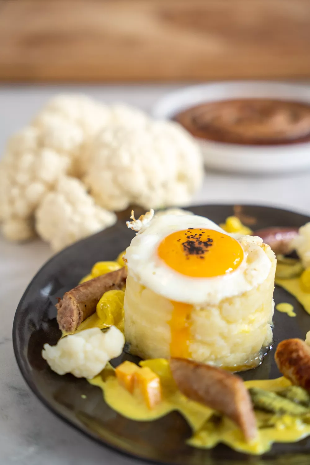 Schep een flinke lepel brandade op een bord en verdeel er de picklessaus rond. Snijd de chipolata’s in stukjes en dresseer ze bij de puree. Werk het bord af met een spiegelei en enkele bloemkoolroosjes.
