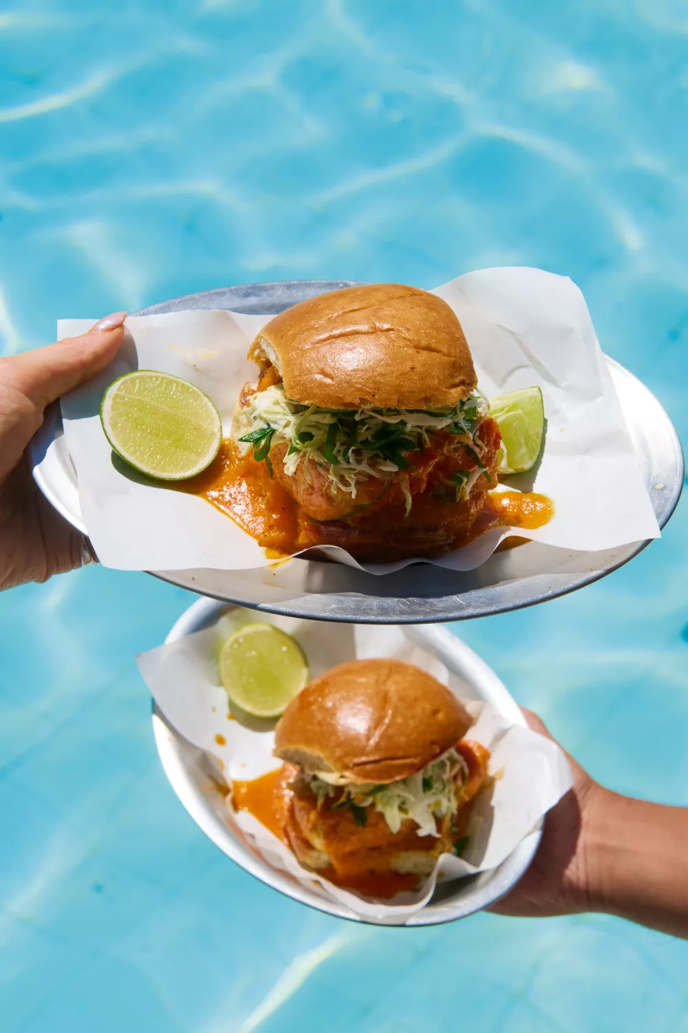 Leg een visfilet op de onderste helft van een broodje en schep er flink wat saus over. Schep er een ruime hoeveelheid koolsla op en leg de bovenste helft van het broodje erop. Meteen opdienen, met een kom van de saus erbij, om de burgers in te dopen, en wat extra limoensap.