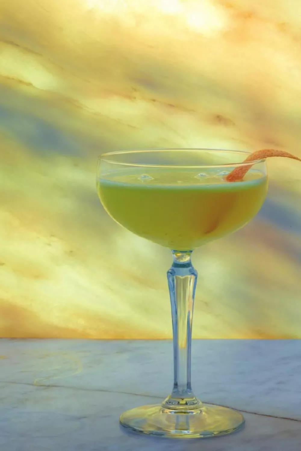 Neem de sinaasappel en snijd de zeste flinterdun over de oppervlakte van de cocktail, zodat de aromatische oliën zich kunnen verspreiden over het glas.