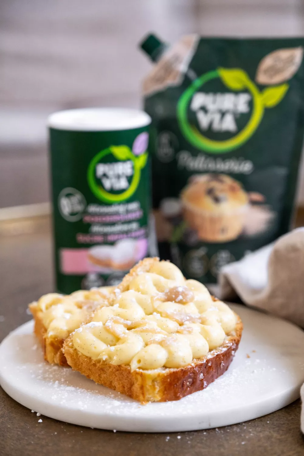 Een luchtige brioche gevuld met fluweelzachte crème patissière en een romige karamel, perfect voor brunch, dessert of een feestelijk ontbijt. Het deeg met zelfrijzende bloem, Pure Via Patisserie, zure room en gist wordt zacht gekneed en rustend laten rijzen voor een goudbruine korst met een subtiel snufje grof zeezout. De vanillecrème en huisgemaakte, licht gekaramelliseerde saus geven elke plak een luxueuze, zoete touch.