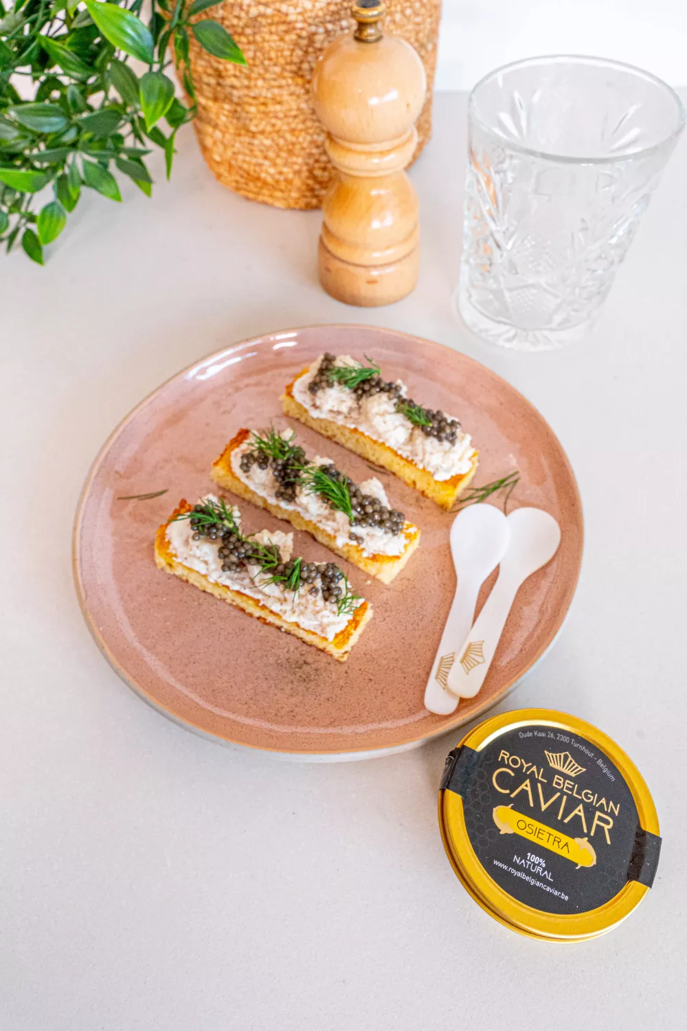 Romige mousse van gerookte steur en roomkaas op krokant gebakken brioche, afgewerkt met luxe kaviaar en pittige mierikswortel, levert een zilt en verfijnd hapje. Het eenvoudige blenden, smeren en bakken maakt dit gerecht ideaal als feestelijk aperitief of elegant borrelhapje bij de feestdagen of een zomerse borrel. Werk af met dille en een drupje olijfolie voor extra aroma.