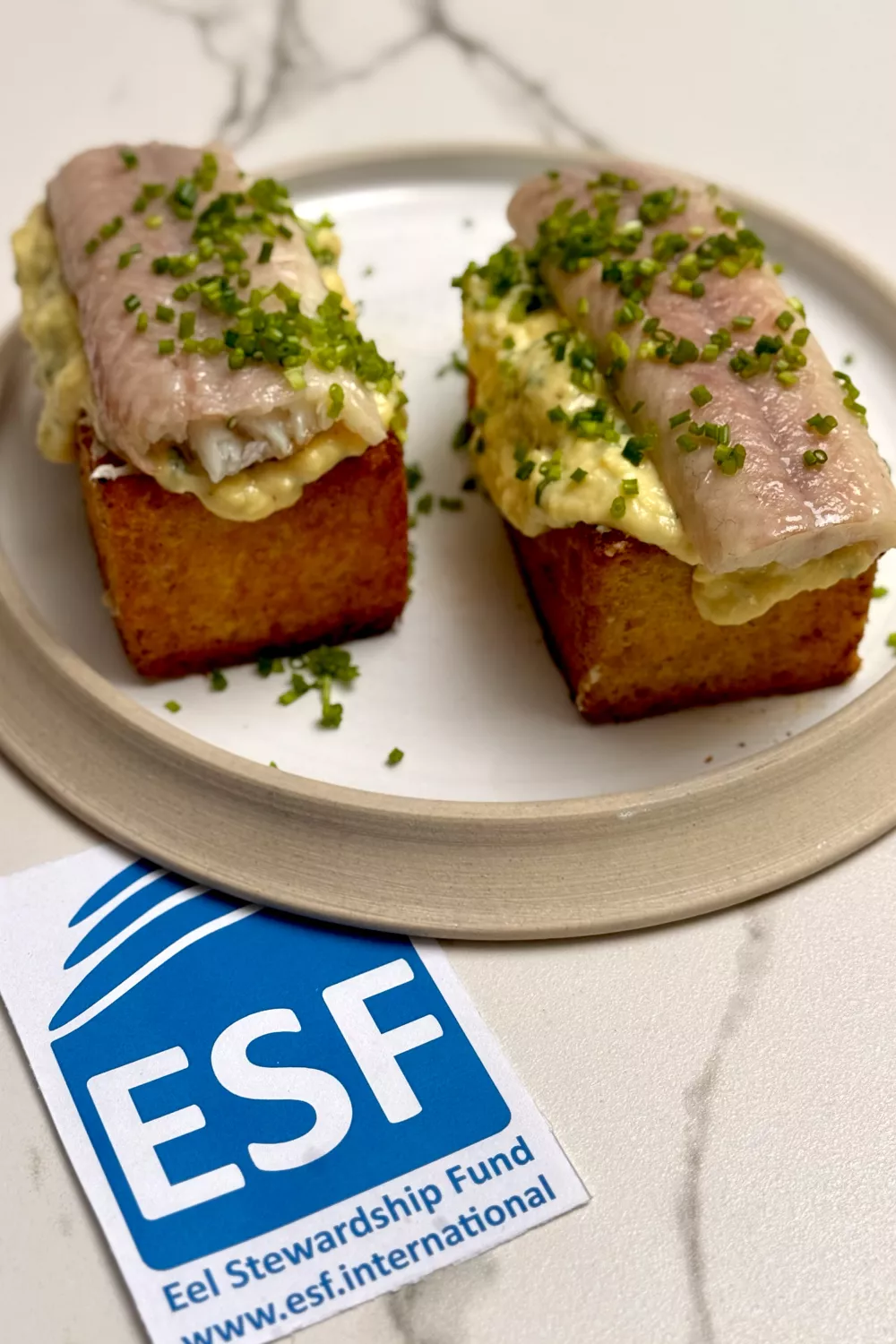 Schik de briochebalkjes op een bord. Wrijf ze in met wat zure room en werk af met grof zout. Lepel er de zachte scrambled eggs over. Werk af met stukjes paling en extra bieslook.