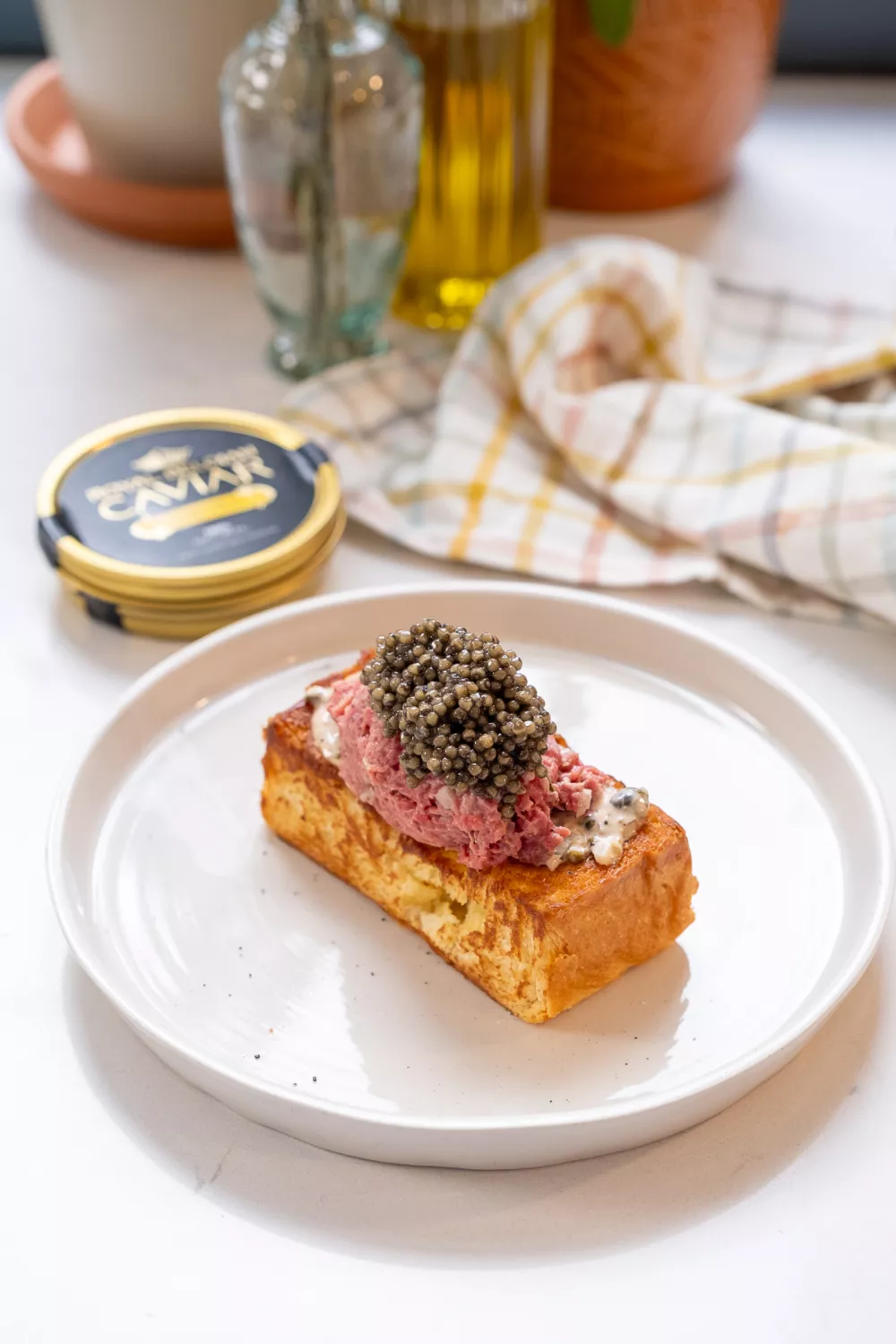 Een luxueus voorgerecht van brioche met huisgemaakte steak tartaar en een kaviaarfinish, ideaal voor een feestelijke borrel of elegant diner. Het knapperig gebakken briochebrood vormt de perfecte basis voor fijngesneden ossenhaas die met een pittige dressing van mayo, ketchup, mosterd, sjalot en kappertjes wordt gemengd. Met een quenelle tartaar en enkele korreltjes Royal Belgian Caviar krijgt dit hapje een ziltige, verfijnde toets die zowel bij lenteborrels als winterse feestdagen past.