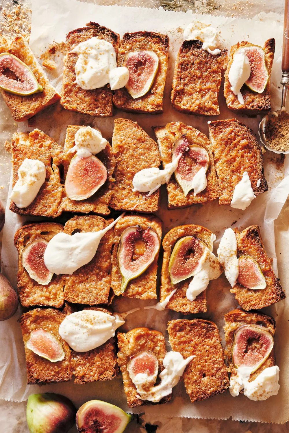 Leg op ongeveer de helft van de sneetjes brioche een plakje vijg. Zet 10-15 minuten in de oven. Lepel op ieder briochebroodje een theelepel hangop en bestrooi met het anijszaad.