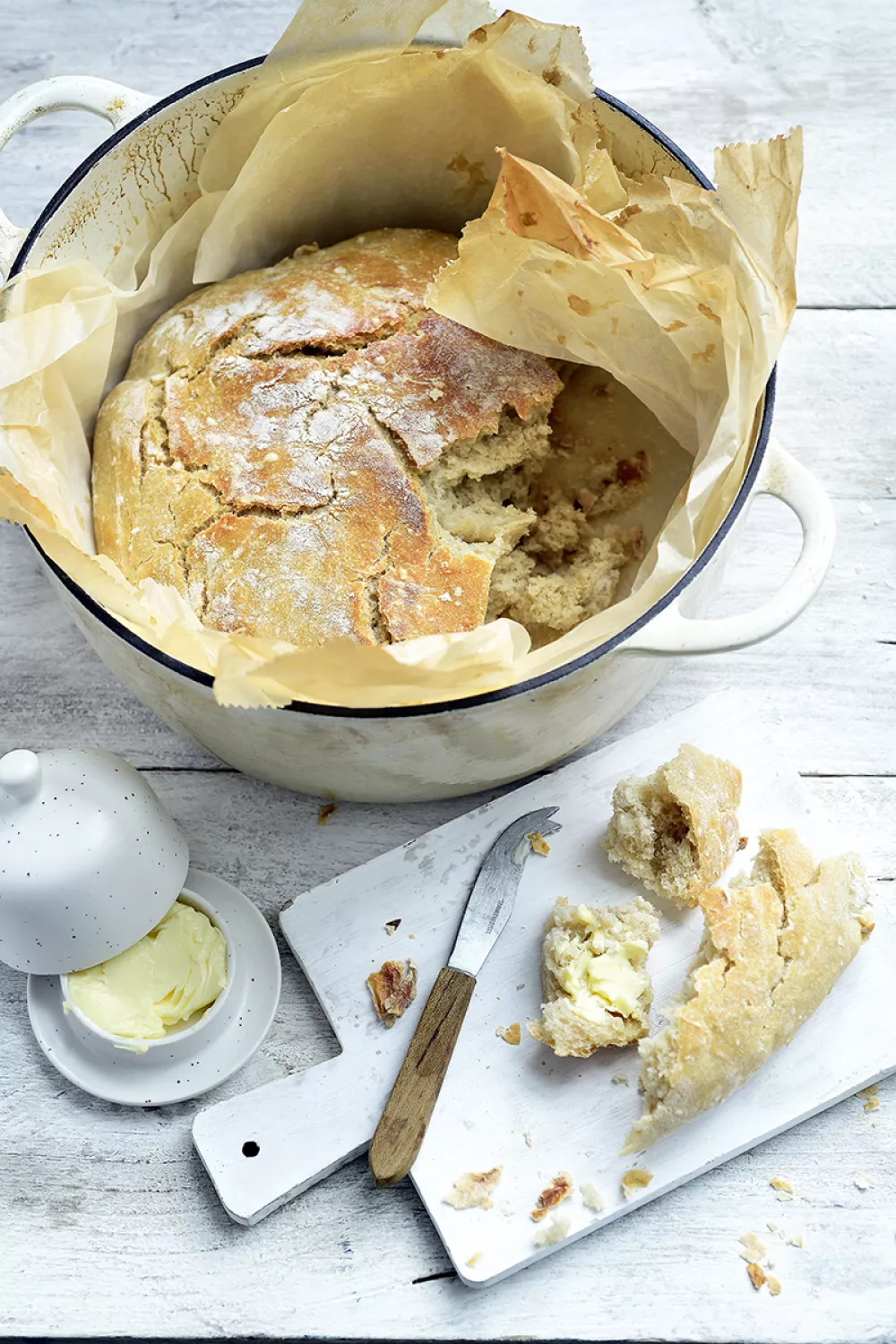 Haal de pot uit de oven en leg er het brood met bakpapier in zijn geheel in. Strijk eventuele deuken van het bakpapier in het deeg glad en zet de deksel op de pot. Bak 30 minuten. Haal de deksel van de pot en bak nog eens 10 minuten.