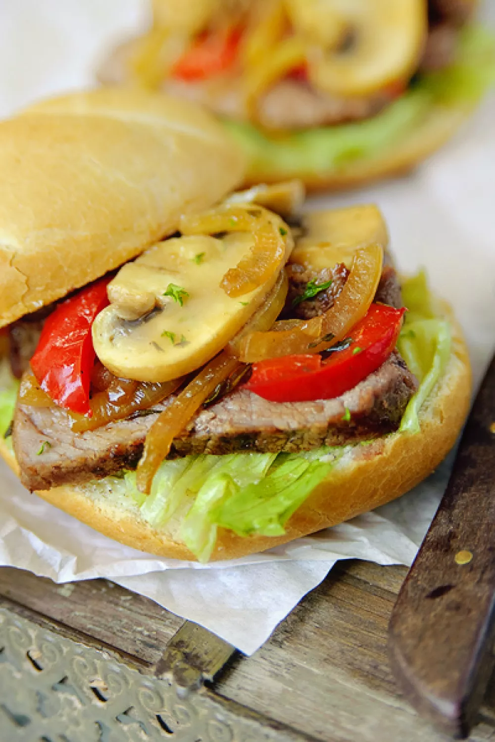 Een sappig broodje biefstuk met peperboter, geroerbakte paprika en champignons is ideaal als hartige lunch of snelle avondmaaltijd. De biefstuk wordt kort op hoog vuur aangebakken en daarna laten rusten voor optimale sappigheid, terwijl ui en groenten met Worcestershiresaus en tijm rijk van smaak worden. Serveer op knapperige witte broodjes met ijsbergsla voor een fijn contrast in textuur en aroma.