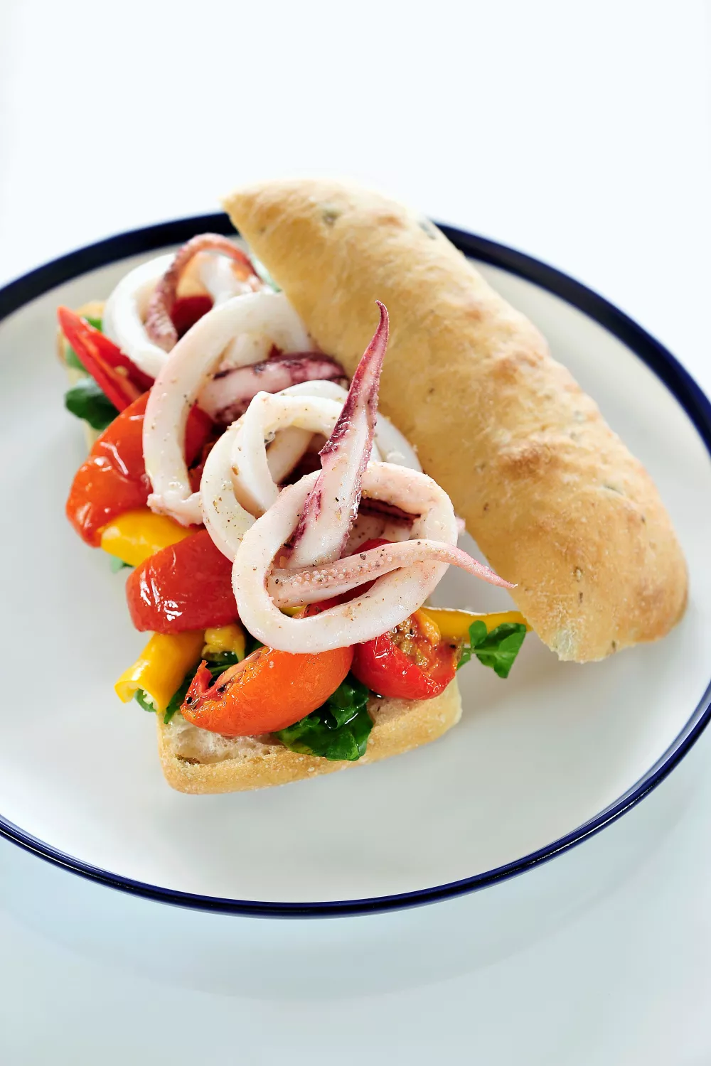 Een knapperig ciabattabroodje belegd met goudbruin gebakken pijlinktvis, frisse veldsla en zoete zongedroogde tomaatjes voor een zomerse lunch met Mediterrane toets. De tentakels en ringen worden kort in olijfolie gebakken tot ze mals en licht gekarameliseerd zijn, afgewerkt met een pittig geel pepertje. Snel, smaakvol en perfect voor op het terras.