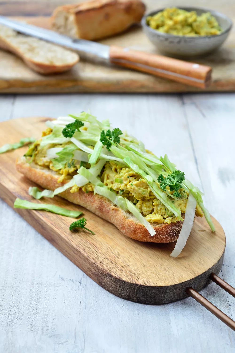 Een smeuïg broodje kip curry met zacht roerei en malse kipblokjes op krokante ciabatta en frisse ijsbergsla. Romige mayonaise met currypoeder, geraspte Parmezaanse kaas en een snufje cayenne geeft het broodje een warme, licht pittige smaak. Perfect als snelle lunch, picknick of hartige keuze voor lente en zomer.
