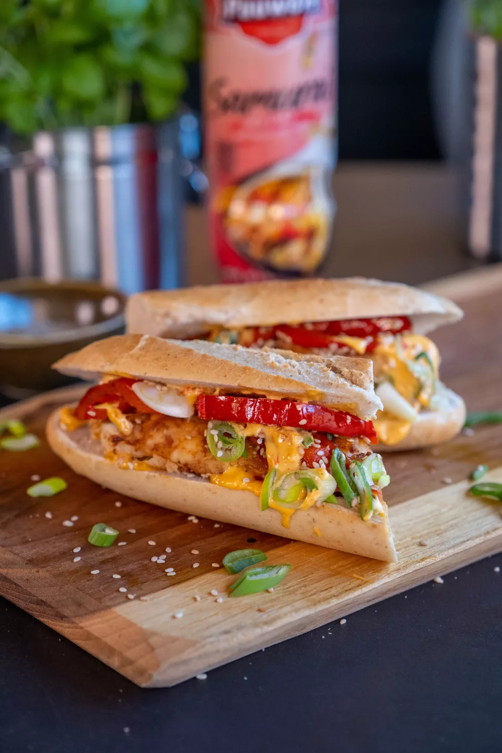 Een smaakvol broodje met karnemelkgemarineerde kip die krokant in bloem wordt gebakken en gecombineerd met pittige Pauwels samoeraisaus, knapperige paprikareepjes en geroosterd sesamzaad. De afbakbroodjes worden in de oven krokant gebakken zodat elk hapje contrasteert tussen luchtig brood en sappige vulling met fijngehakte lenteui voor frisheid. Perfect als snelle lunch, weekend streetfood of zomerse picknick.