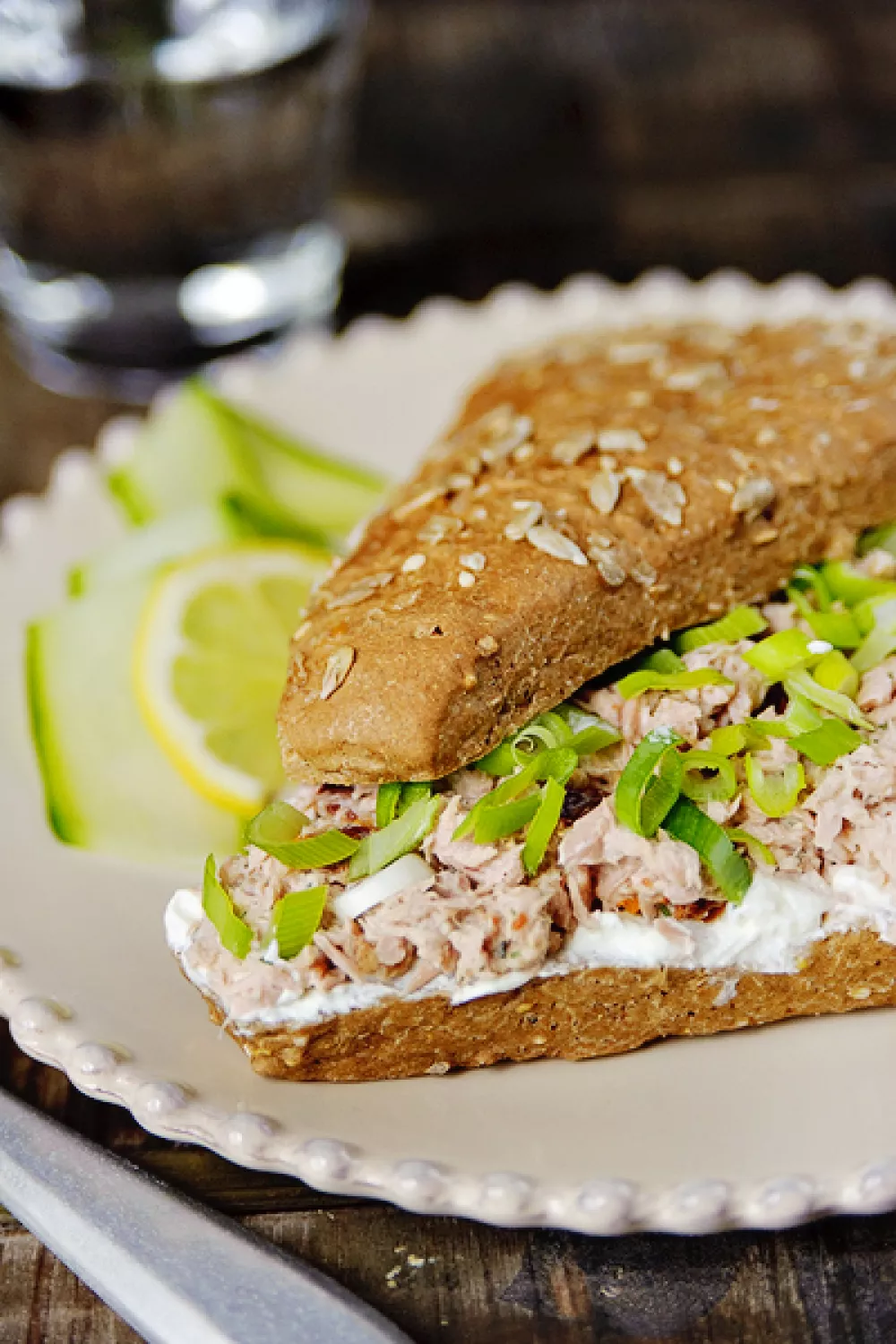 Romig en fris broodje tonijn met zongedroogde tomaatjes en Griekse yoghurt, ideaal voor een snelle lunch of zomerse picknick. De tonijn wordt op smaak gebracht met citroen en Italiaanse kruiden en luchtig gemengd met mayonaise en yoghurt. Op knapperig brood gesmeerd en afgewerkt met fijngesneden lenteuitjes voor extra kleur en bite.