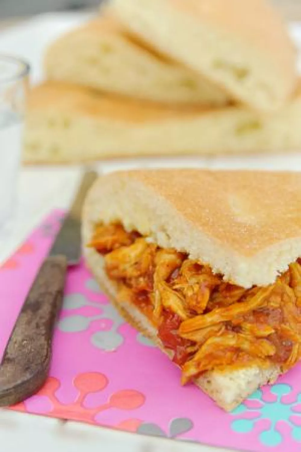 Een broodje met sappige pulled chicken op warm platbrood, badend in een huisgemaakte zoetzure barbecuesaus. Ui, paprika en knoflook worden zacht gefruit, daarna koken ketchup, appelciderazijn, zoete chilisaus en worcestersaus met tabasco, citroen en bruine suiker in, gekruid met paprikapoeder, kerrie en mosterdpoeder. De kip suddert gaar, wordt geplukt en kort doorgewarmd. Ideaal voor een snelle lunch, streetfood avondmaal of zomerse picknick.