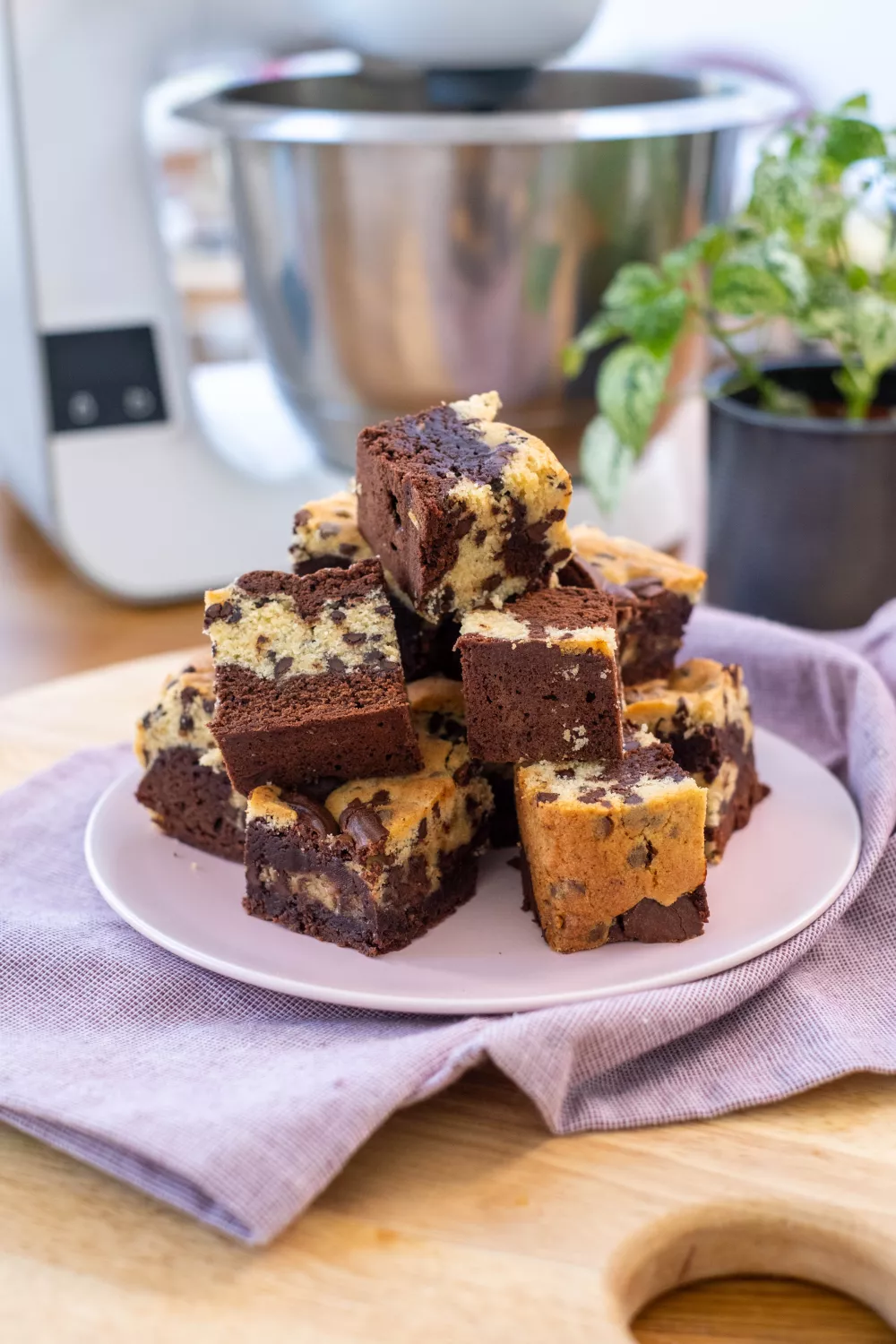Maak nu de chocolate chip cookie laag. Doe de boter en de suiker samen in de keukenrobot (gebruik de vlinderhaak) en klop luchtig. Voeg vervolgens één voor één het ei, de bloem en het zout toe. Meng als laatste de chocolate chips er nog onder. Neem een brownievorm en bedek deze met een laagje bakpapier. Giet er 1/3de van het browniemengsel in en lepel er vervolgens om de beurt een lepel koekjesdeeg en een lepel browniebeslag in zodat je een mooi gevlekt patroon krijgt.