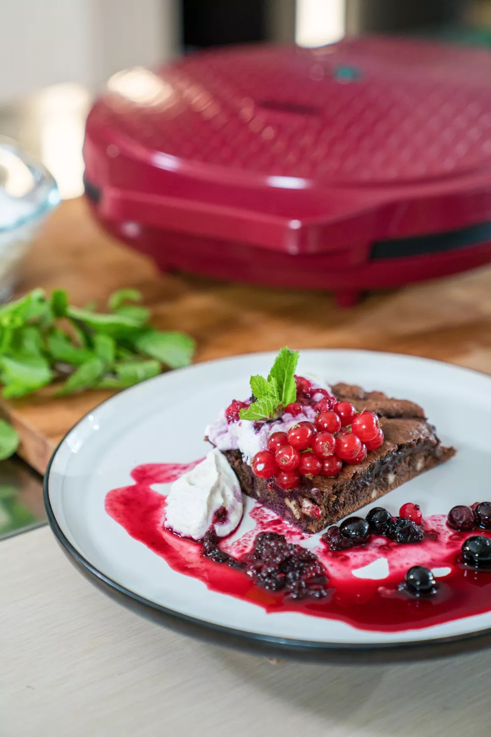 Deze fudgy brownie met vanille-ricotta en een warm sausje van rood fruit combineert rijke chocolade, knapperige pecannoten en een subtiele toets frambozenlikeur tot een feestelijk dessert. De romige ricotta met vanille vormt een frisse tegenhanger terwijl het fruit zacht compoteert op het vuur. Snel in de Domo Pizza Maker of gewone oven te bereiden en perfect voor zomerse tuinfeestjes of een knusse herfst- of winteravond.