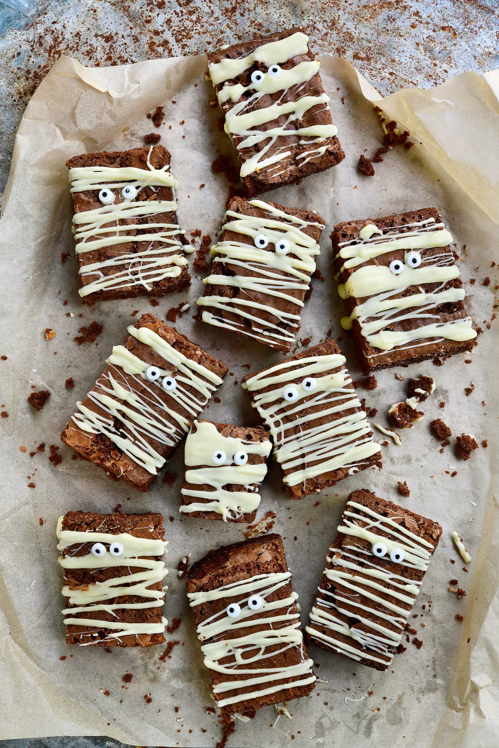 Snijd de brownie in rechthoeken en smelt de witte chocolade au bain-marie. Doe in een spuitzak en spuit er een mummie-patroon mee op de browniestukken. Werk ze af met oogjes.