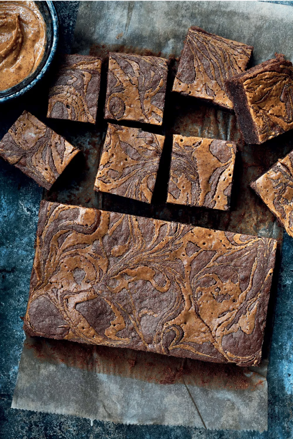 Verwarm de pindakaas kort in de microgolf zodat hij wat lopender wordt. Verdeel de pindakaas over het browniebeslag en maak met een vork of mes diagonale bewegingen voor een swirl-effect.
