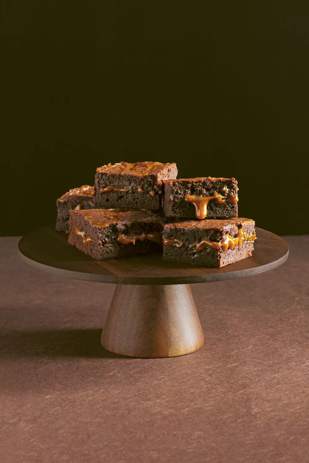 Giet de helft van het beslag in het bakblik en strijk de apart gehouden dulce de leche er met een spatel in een egale laag op, zonder de laagjes te mengen. Giet de rest van het beslag erop en strijk het oppervlak glad. Vul een wegwerpspuitzak met de resterende dulce de leche, knip het puntje eraf en spuit hem in een doorlopend zigzagpatroon op het beslag. Bak de brownie 30 minuten in de voorverwarmde oven, haal hem eruit, laat hem in het blik afkoelen en snijd hem in blokjes.