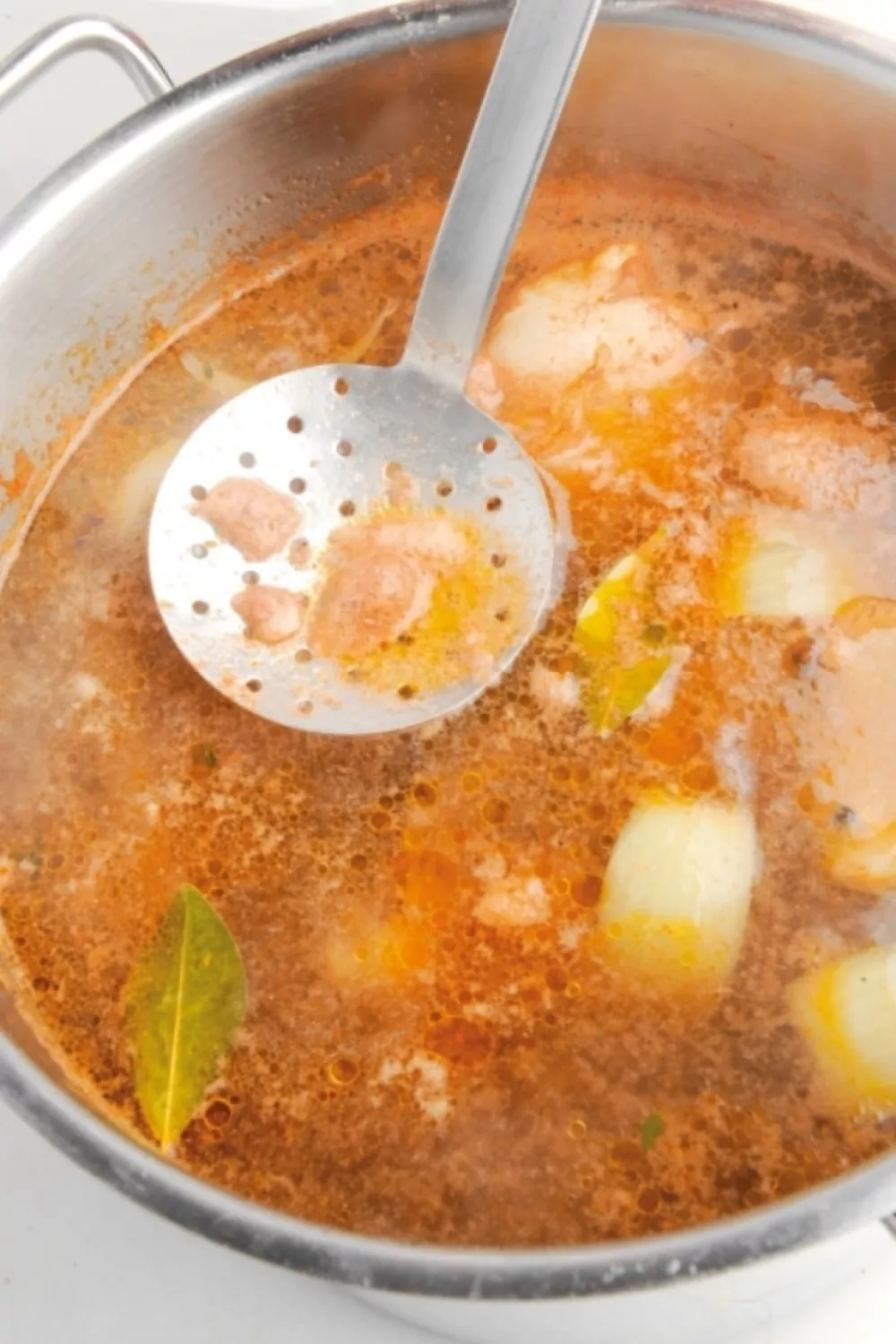 Verwijder de vetlaag bovenop de bouillon en kook de fond eventueel wat verder in voor een intensere smaak.
