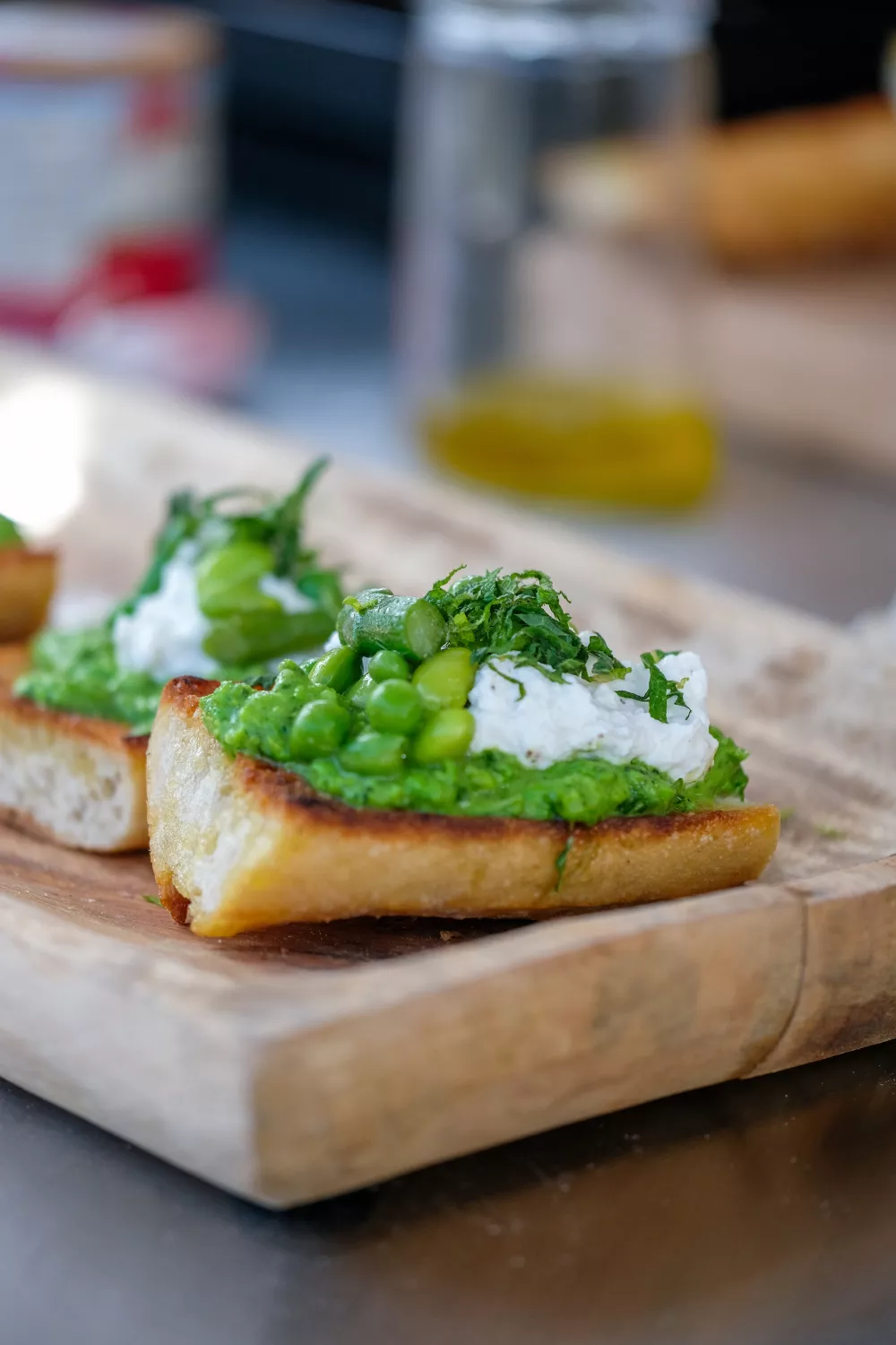 Beleg elk stukje stokbrood met een lepeltje erwtenpuree en een lepeltje ricotta. Werk af met enkele tuinbonen, stukjes groene asperge, verse erwtjes en wat fijngehakte munt.