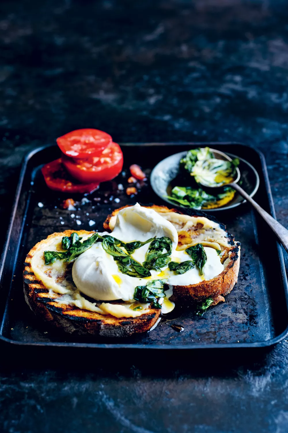 Besmeer het brood met de geprakte gepofte knoflook en leg de burrata erop. Schep de gekneusde basilicum erop en dien op met tomaat.