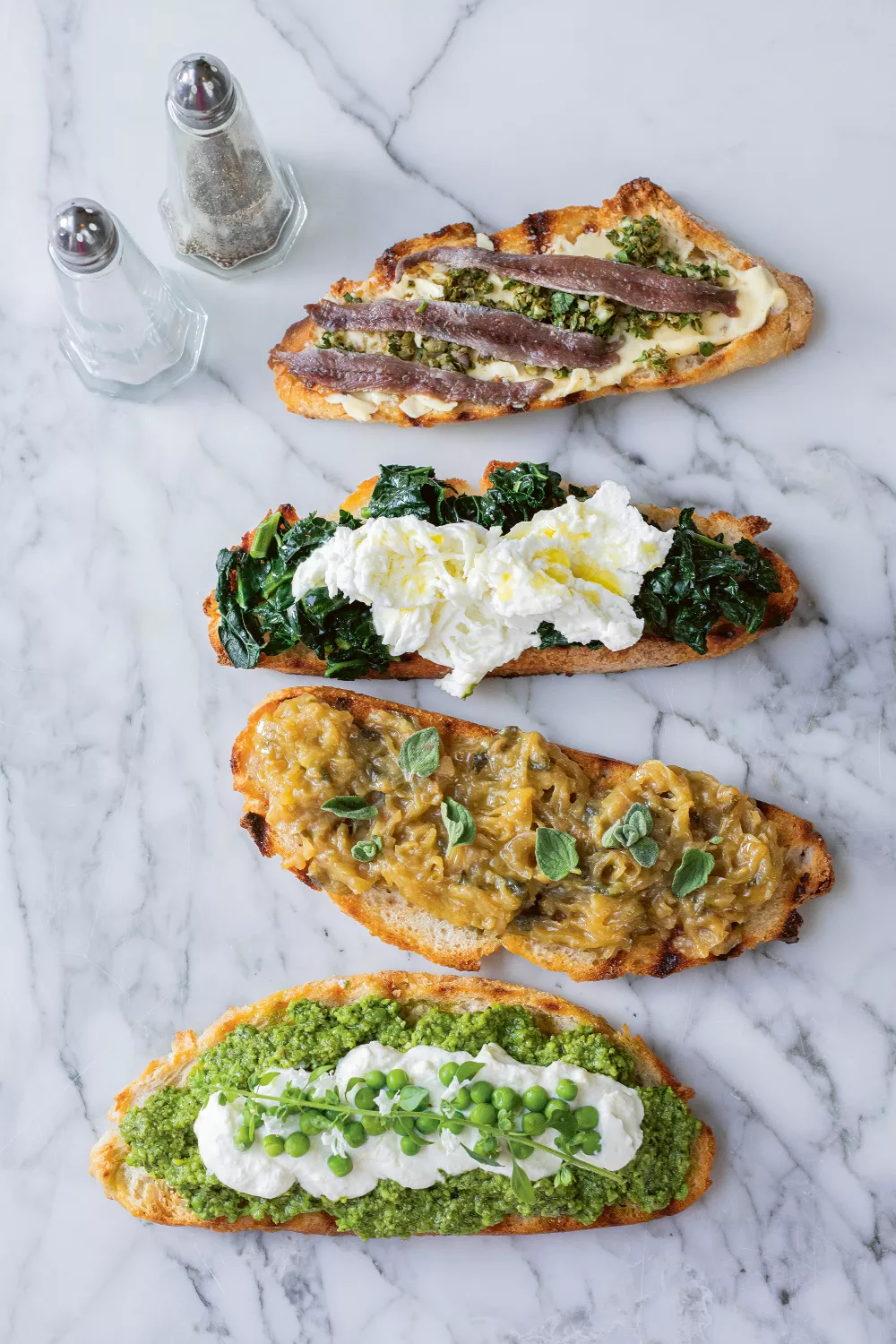 Knapperige bruschette met een frisse erwtenricotta van munt en dragon, afgewisseld met zoute ansjovis en kappertjes voor een hartige bite. Cavolo nero en gescheurde mozzarella geven diepgang en romigheid, terwijl langzaam gesmoorde uien met knoflook en oregano het geheel warmte en geur geven. Ideaal als borrelhapje, lunch of voorgerecht en makkelijk in de oven of op de barbecue te bereiden.