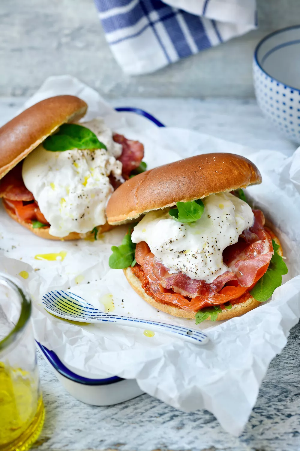 Verwen jezelf met deze luxe burrata burger: krokante pancetta, romige burrata en verse rucola op zachte briochebroodjes, afgewerkt met sappige tomaat en pittige rode pesto. Deze burger combineert het beste van hartig, romig en knapperig in één gerecht en is perfect voor een gezellige burgeravond met vrienden.
