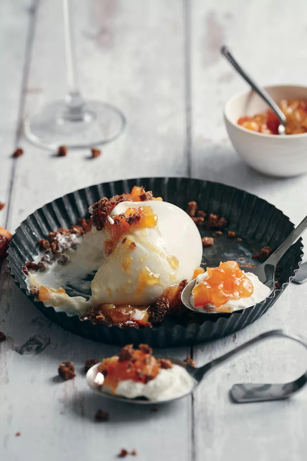Burrata met bloedsinaasappelmarmelade en roggebroodkruim
