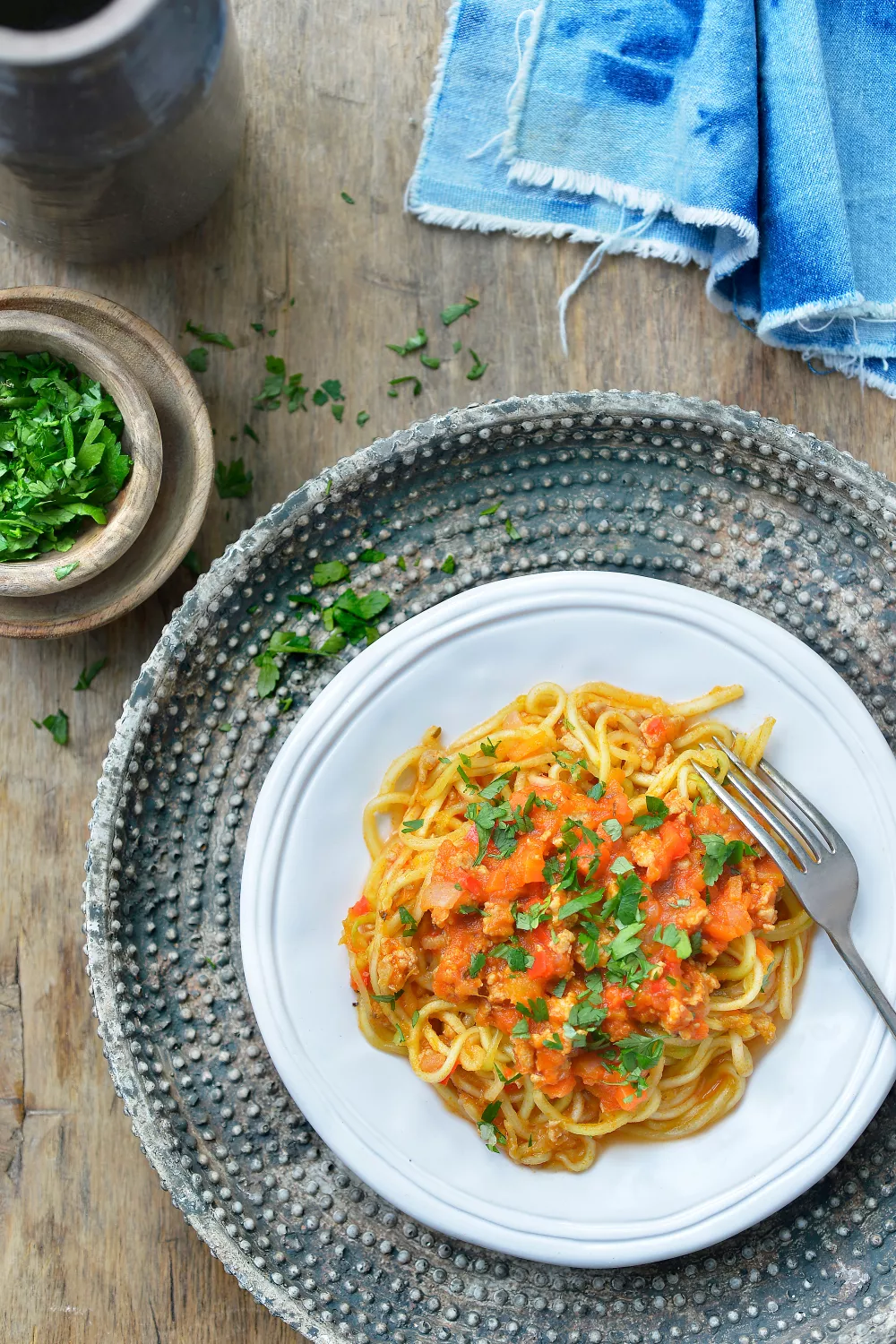 Een verrassend lichte doch hartige maaltijd waarin zoete butternut pompoen en knapperige paprika samenkomen met kruidig kippengehakt in een geurige tomatensaus. Wortel, ui en knoflook geven diepte, tijm en een vleugje kardemom zorgen voor warme smaaktonen. Serveer op een bed van frisse courgetti voor een snelle doordeweekse maaltijd of een gezellige herfsttafel. Simpel te sauteren en kort te laten sudderen voor volle smaak.
