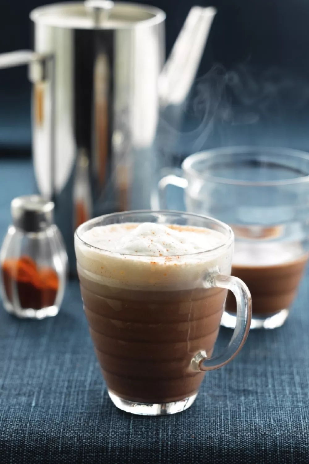 Serveer de cacaomelk in hete mokken en schep er het melkschuim op.