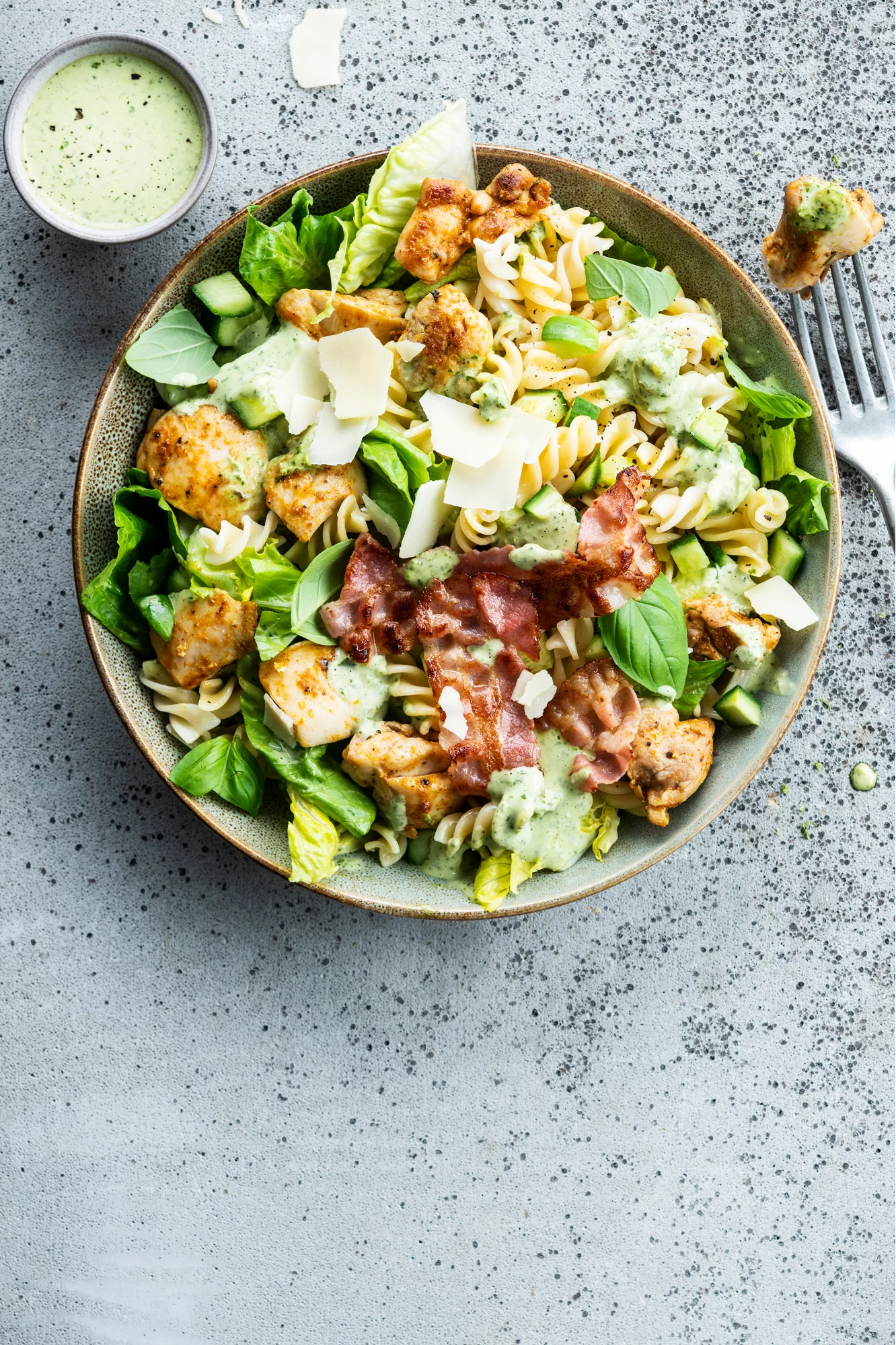 Deze Caesar pastasalade is een frisse en vullende maaltijdsalade met sappige kip, krokant spek en een romige basilicumdressing. Door de combinatie van pasta, Romeinse sla en Italiaanse kaas krijgt deze klassieker een verrassende twist. Het recept is eenvoudig te maken en ideaal als snelle doordeweekse maaltijd of lunch. Perfect voor wie houdt van een vertrouwde smaak met net dat tikkeltje extra.