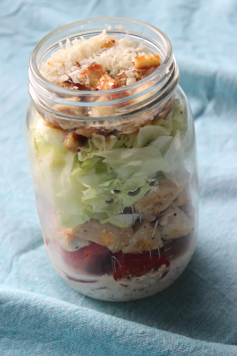 Neem een saladejar en giet de dressing op de bodem. Vul daarna verder op met de rode ui, de kerstomaatjes, de blokjes kip, het hardgekookte ei, de fijngesneden ijsbergsla en de croutons. Werk af met een laagje Parmezaanse kaas.
