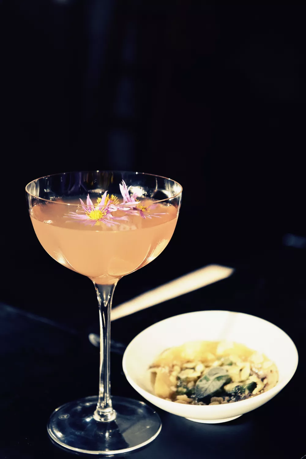 Verwijder het ijs uit de coupette en strain de cocktail er in. Werk af met een eetbaar bloemetje.