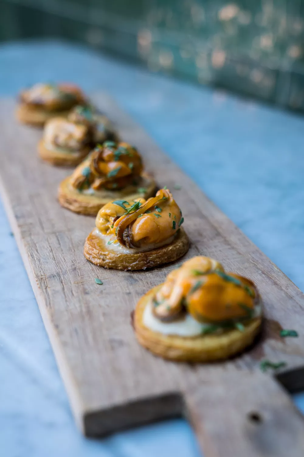Canapé van aardappel met mosselen en dragondressing