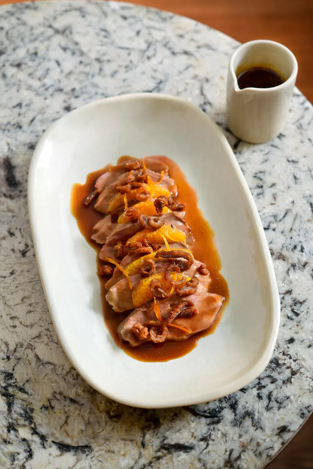 Haal de eendenborsten uit de oven en verwijder de vetlaag. Laat de filets enkele minuten rusten in aluminiumfolie. Snijd het verwijderde vet in fijne stukjes en bak het krokant in een pan. Snijd de eendenborsten in plakjes. Schik die op de borden, samen met de sinaasappelpartjes. Lepel de saus over het vlees. Werk af met de krokant gebakken eendenvetstukjes en de gekonfijte sinaasappelzestes.