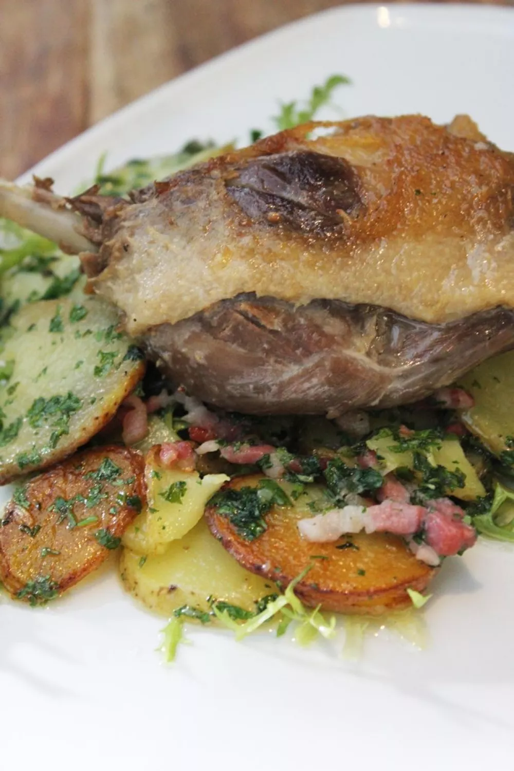Canard confit is een klassieke Franse bereiding van langzaam gegaarde eendenbout in eendenvet, met een knapperige huid en diepe, kruidige smaken door een zout- en kruidenmarinade. Serveer met in eendenvet gebakken dunne aardappelschijfjes, reepjes gerookt spek en een frisse frisée salade met mosterdvinaigrette. Een warm, feestelijk gerecht voor herfstige of winterse diners.