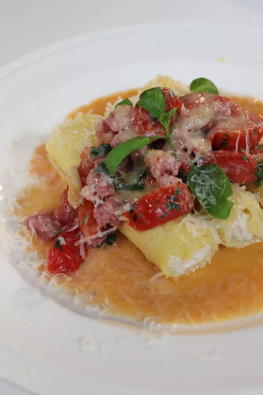 Romige ricotta met een lepeltje mascarpone en pittige salciccia vullen huisgemaakte semola cannelloni en vormen zo een hartig, troostrijk pastagerecht. Knapperige randjes van de pan, zoete kerstomaatjes en verse basilicum zorgen voor frisse tonen en veel textuur. Snel te maken met de pastamachine, sauteren en een korte oventijd, ideaal voor een gezellig diner of een doordeweekse comfortmaaltijd.