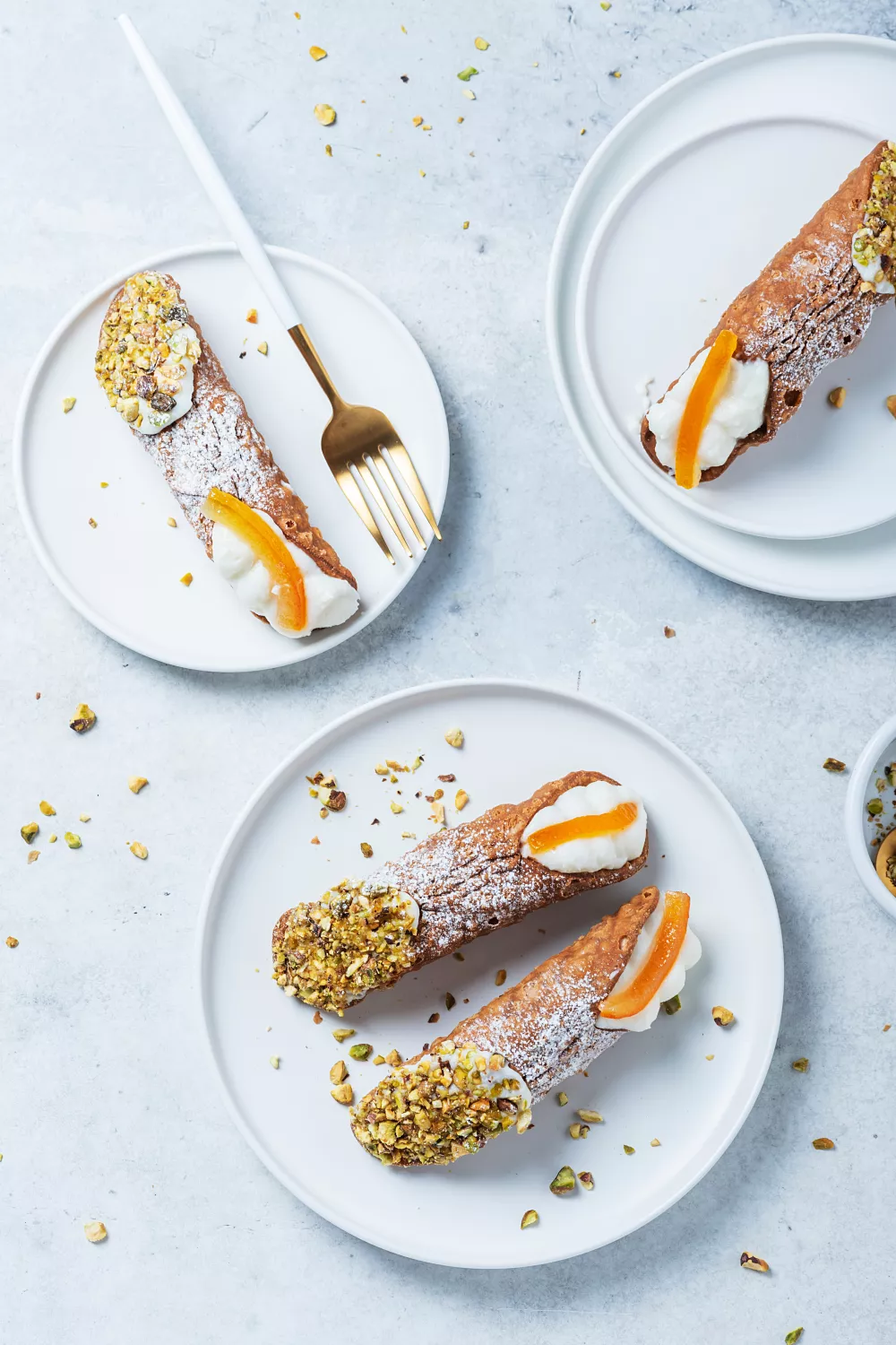 Maak nu de vulling door de ricotta, suiker en sinaasappelzeste met elkaar los te kloppen. Doe de vulling in een spuitzak. Vul de cannoli aan de hand van de spuitzak wanneer ze volledig afgekoeld zijn. Werk de cannoli af door aan ieder uiteinde een klein stukje gekonfijte sinaasappel op de vulling te plaatsen of fijngemalen pistachenootjes.