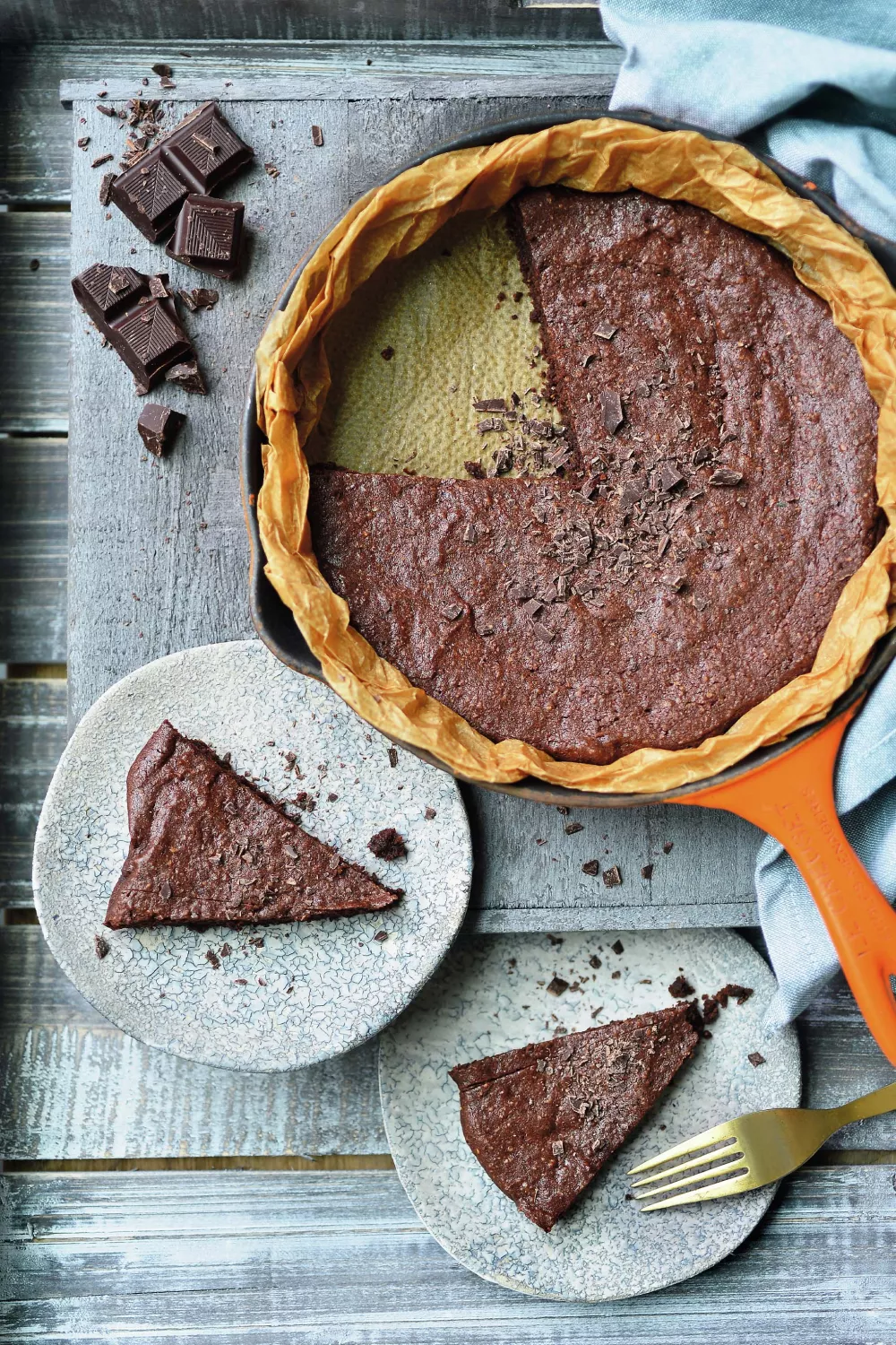 Klop de eiwitten nu stijf en spatel ze dan voorzichtig onder het mengsel. Verwarm de oven voor op 150 graden. Leg het mengsel op een bakpapier in een ronde schotel of een vuurvaste pan. Zet zo’n 20 à 25 minuten in de oven op 150 graden. De koek mag vanbinnen zeker nog wat fudgy zijn. Bewaar tot enkele dagen in de koelkast.