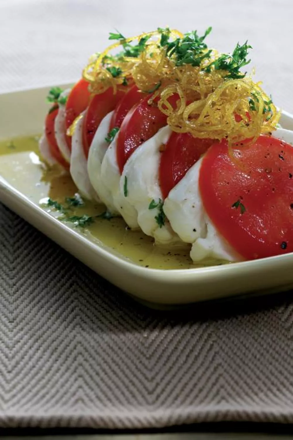 Deze Italiaanse caprese salade met buffelmozzarella en rijpe Romatomaten krijgt extra frisheid en pit door citroenzeste en szechuanpeper. Citroenschil in julienne gaat met sap en olijfolie in een kort gekookte dressing die afgekoeld over de plakjes gaat, afgewerkt met peterselie. Ideaal als zomers voorgerecht, lichte lunch of smakelijk hapje bij de borrel uit de snelle keuken met elegante flair.