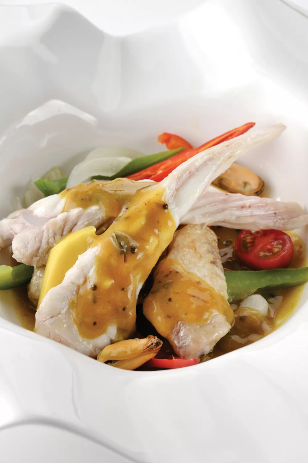 Caripoulet met rog en mosseltjes