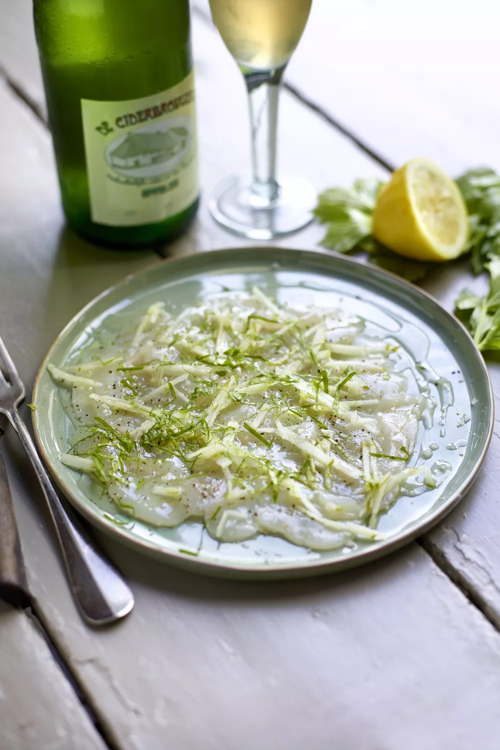 Carpaccio van coquilles en appel met vinaigrette van druivenpitolie