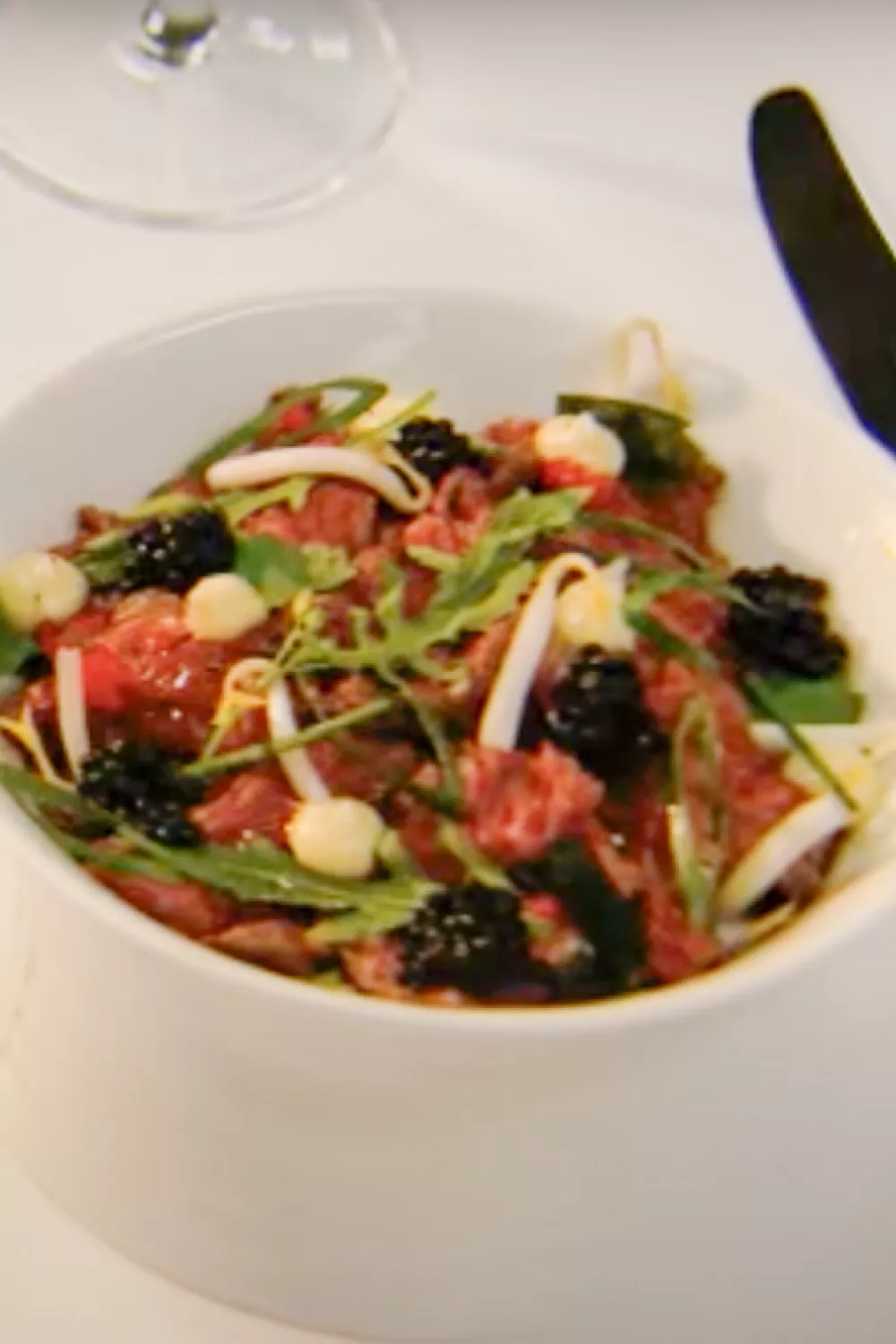 Zachte carpaccio van gemarineerde kraaibiefstuk met limoen, sojasaus en een knapperige Aziatisch geïnspireerde salade van wakame, rucola en gekonfijte gember. Het vlees wordt kort aangebraden en een dag gemarineerd zodat citrus en soja goed intrekken, terwijl wakame even wordt geweekt voor een frisse bite. Afgewerkt met sesammayonaise, lente-ui, koriander en haringkaviaar voor romige, kruidige en zoute accenten, ideaal als verfijnd voorgerecht bij een zomers diner of feestelijke gelegenheid.