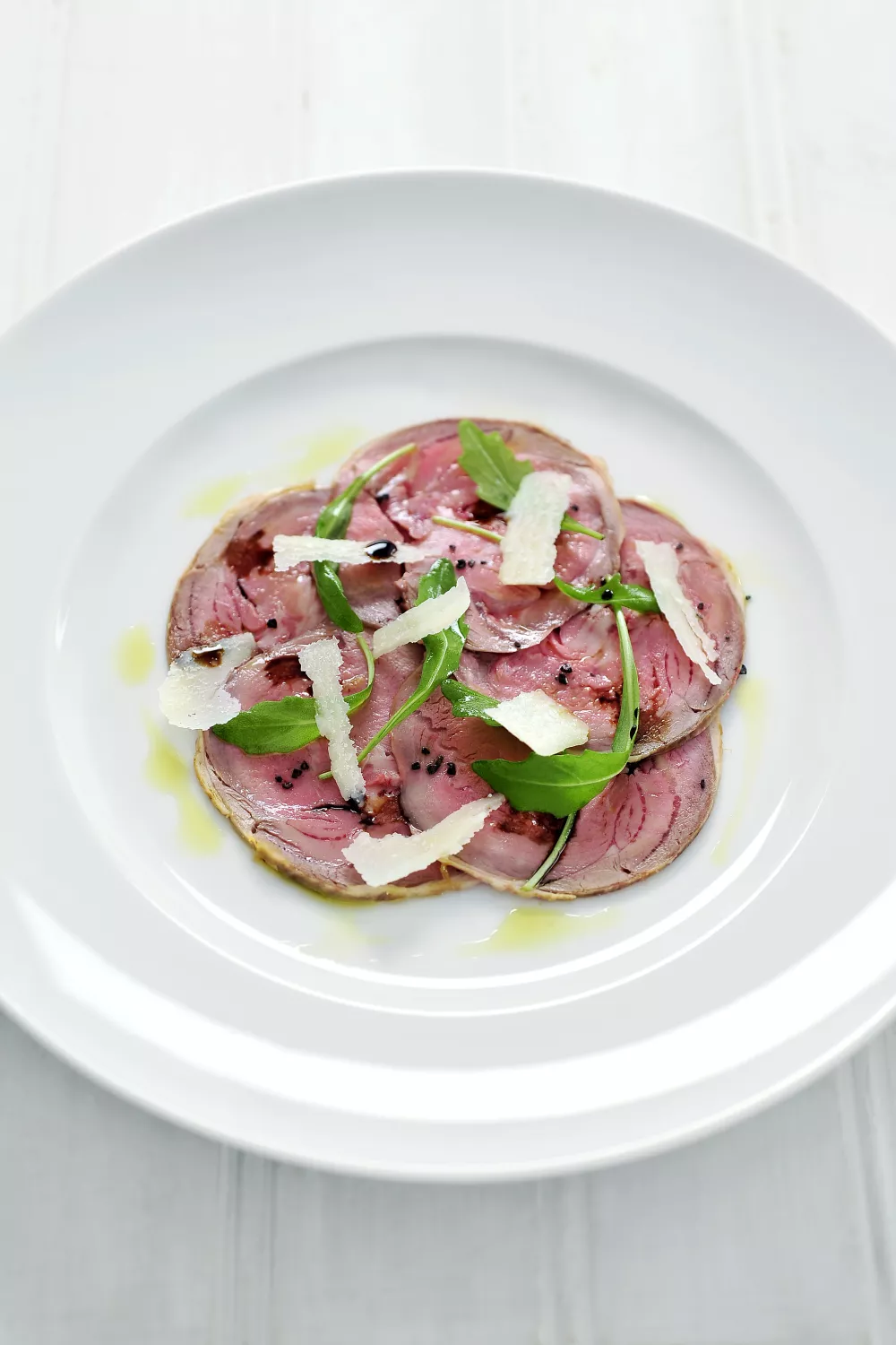Neem voor het serveren een koud bord, met hierop een beetje olijfolie. Snij het vlees in fijne plakjes en schik trapsgewijs op het bord.