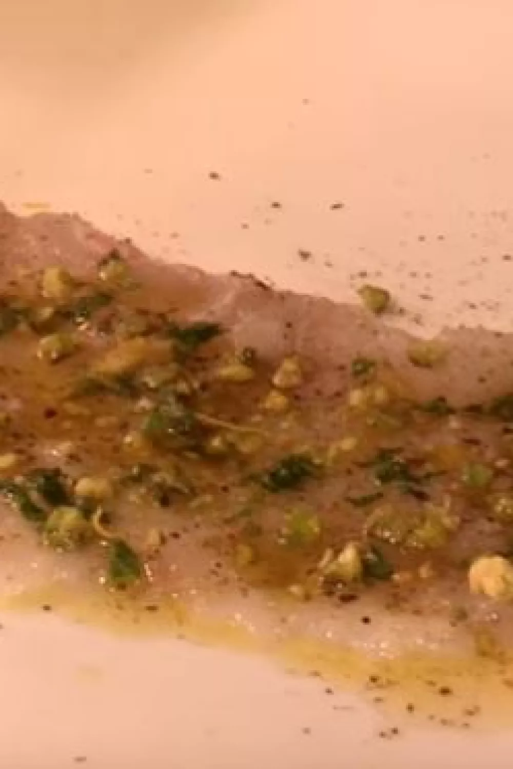 Een verfijnde carpaccio van langoustines, fris en zilt door limoensap en citroenzeste met een zachte toets van knoflook en platte peterselie. Dun gesneden langoustines worden licht platgedrukt en subtiel gekruid met olijfolie, zeezout en peper voor een elegante rauwe bereiding, perfect als zomers voorgerecht of feestelijk aperitief. Afgewerkt met een krokante crumble van pistachenootjes voor extra textuur en kleur.