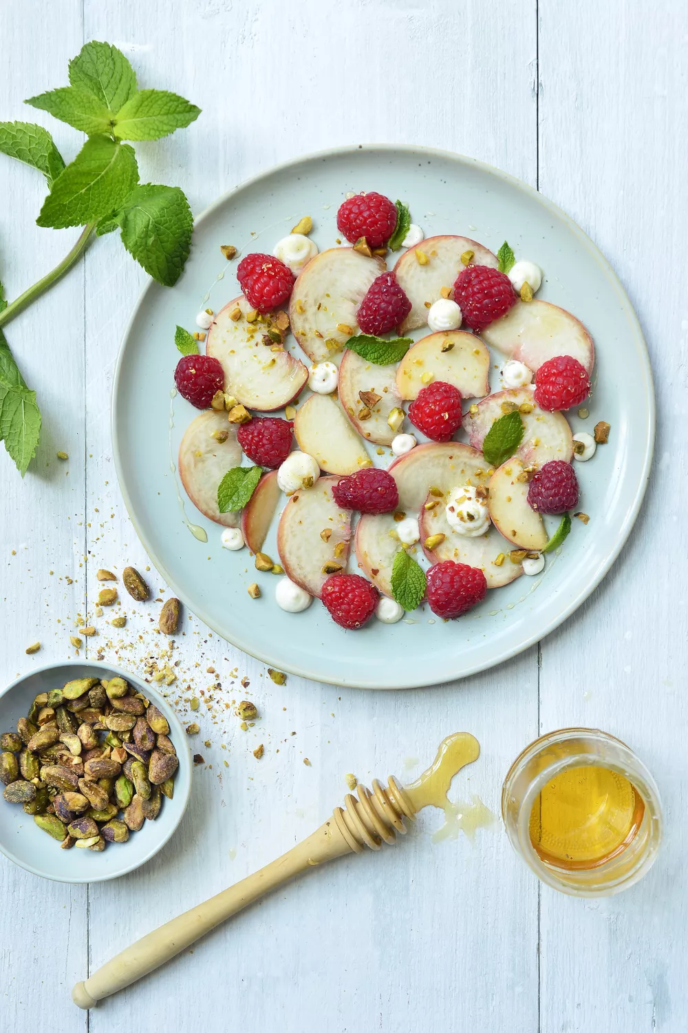 Stappenplan om recept “Carpaccio van perzik met mascarpone en framboos” te bereiden