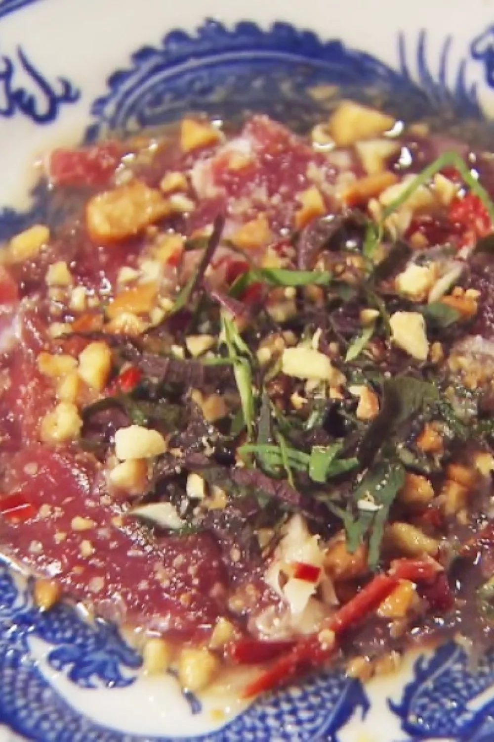 Deze Vietnamese carpaccio van rundsvlees combineert flinterdunne plakjes rauw vlees met een frisse, pittige vinaigrette op basis van vissaus en limoen. Fijngehakte munt, shiso en basilicum samen met sjalot en geroosterde pinda's zorgen voor een aromatische en knapperige toets die ideaal is als zomers voorgerecht of lichte lunch. Een vleugje Spaanse peper en geperste knoflook geven warmte zonder te overheersen.