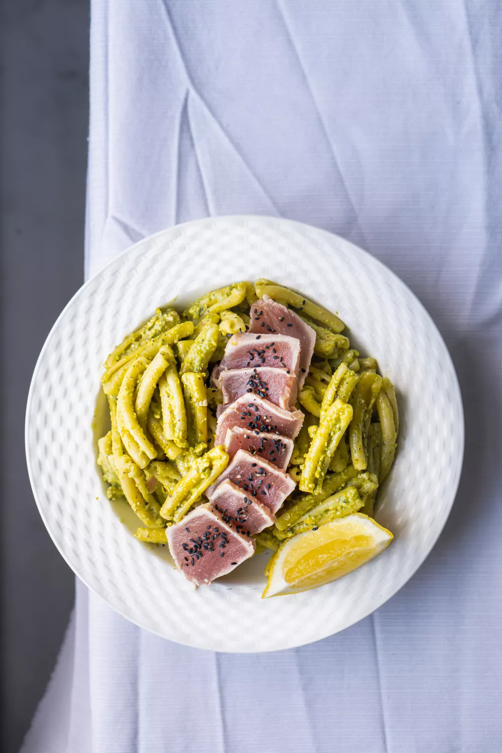 Verdeel de pasta over borden en verdeel de plakjes tonijn daarover. Serveer met een partje citroen en met wat zwarte sesamzaadjes.