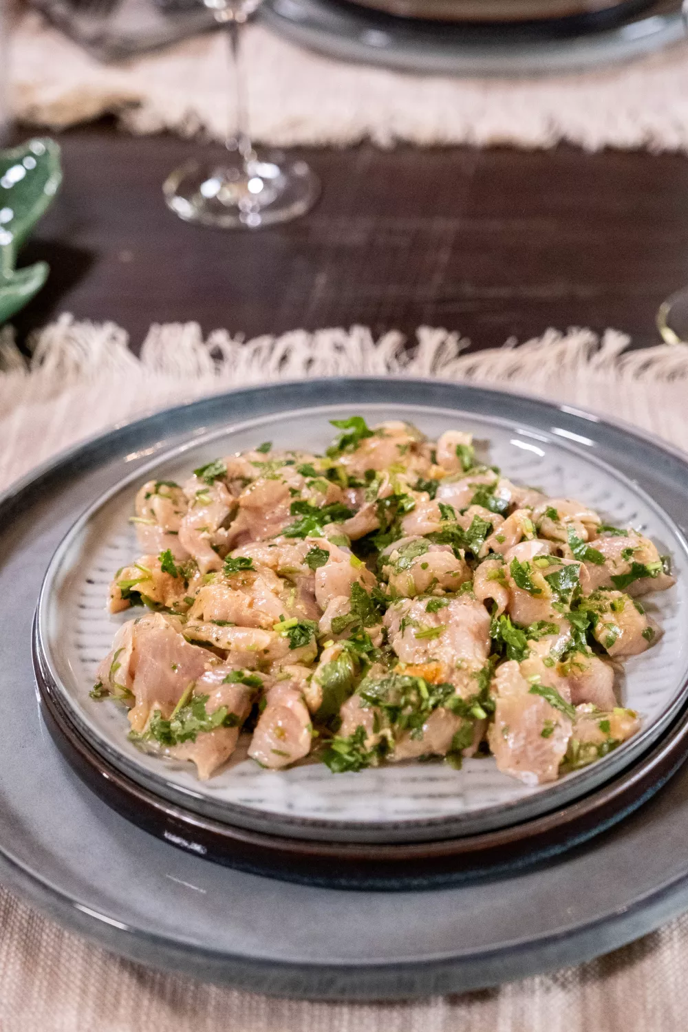 Frisse ceviche van zachte forelfilets, gemarineerd in limoensap met olijfolie, koriander en een subtiel vleugje chilipoeder. Het zuur van de limoen ‘gaart’ de vis en geeft dit voorgerecht een zomerse, levendige smaak die perfect past bij een borrel of lichte lunch. Simpel en snel te bereiden: plakjes snijden, een halfuurtje laten marineren en serveren met een frisse witte wijn.