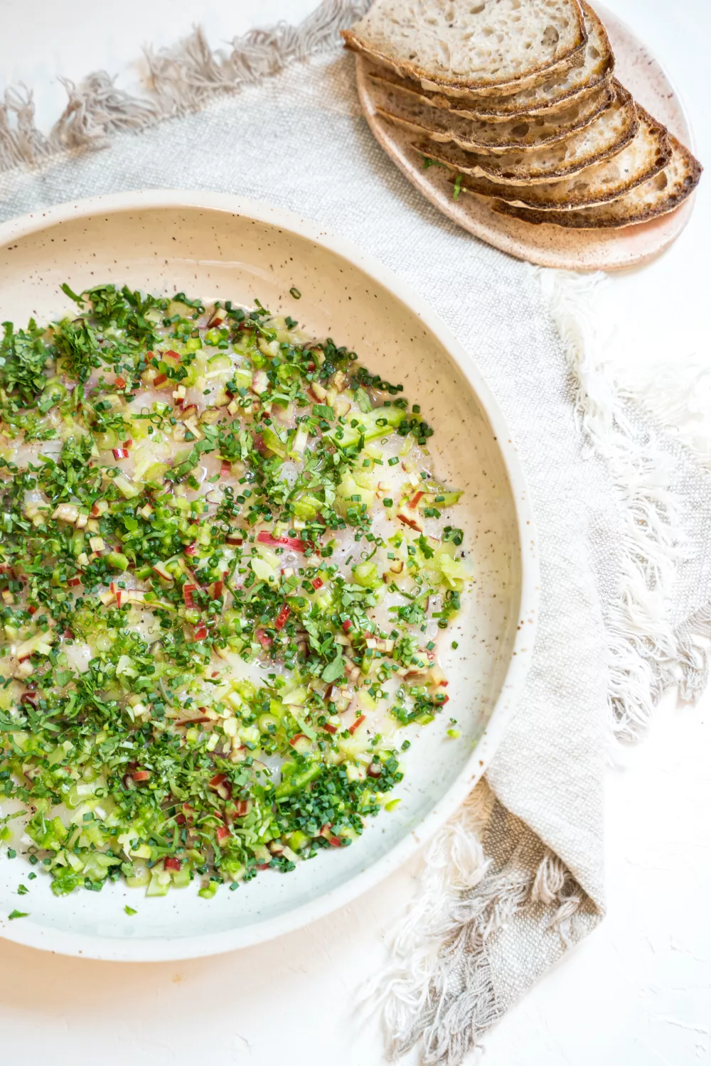 Een lichte, frisse ceviche van zeebaars waarin gepureerde rabarber en hibiscus een bloemig, zuur sap vormen dat de rauwe vis zachtjes marineert. Fijn gesneden venkel, selder, bieslook en koriander geven knapperigheid en kruidigheid, en een lepeltje Griekse yoghurt zorgt voor een romige tegenhanger. Perfect als elegant voorgerecht of zomerse lunch, snel klaar en verrassend fris van smaak.
