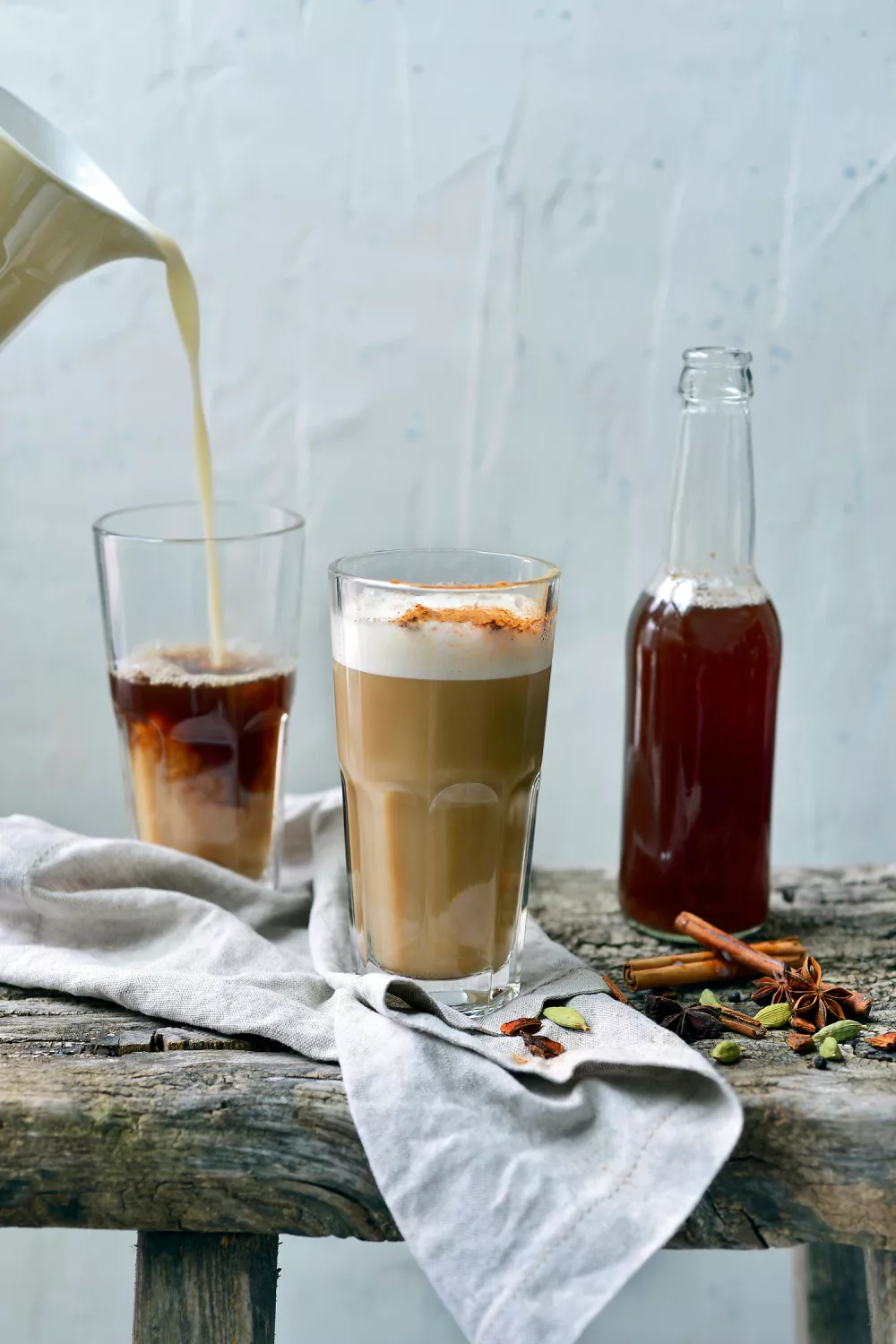 Deze kruidige chai latte combineert verse gember, kaneel, kardemom en zwarte thee met ahornsiroop en romige havermelk voor een verwarmende, plantaardige traktatie. De specerijen worden kort geroosterd en rustig getrokken om diepe aroma's vrij te geven, waarna de melk wordt opgeschuimd tot een fluweelzacht melkschuim. Perfect als zelfgemaakt winterdrankje bij een rustig ontbijt, gezellige brunch of knusse avond.