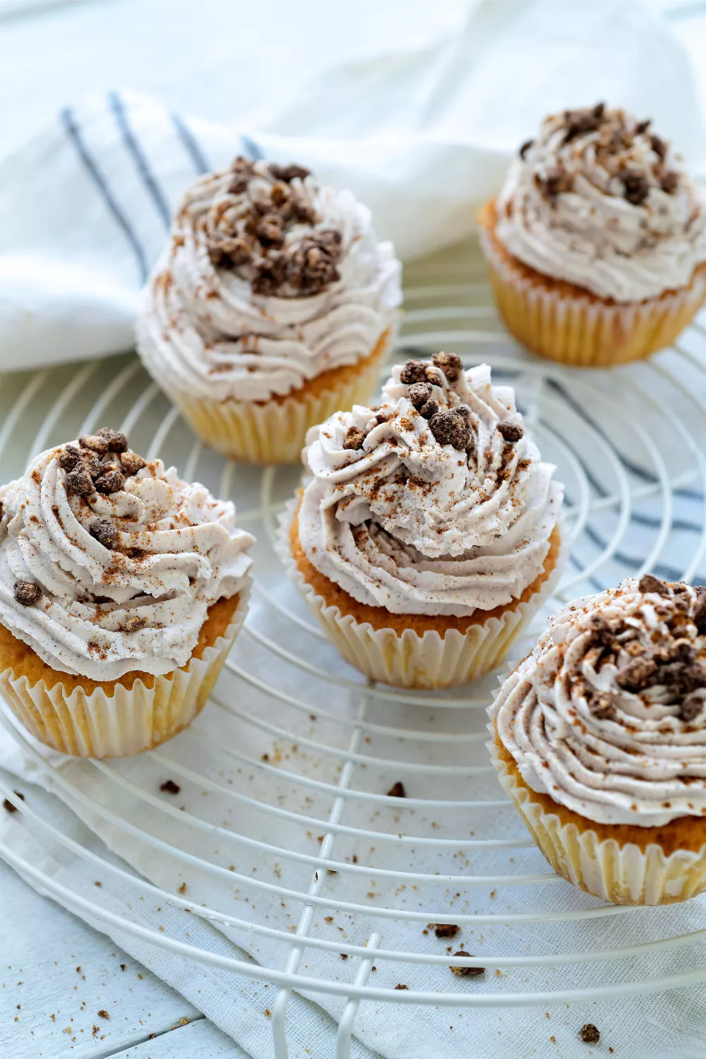 Haal de cakejes uit de oven en laat ze afkoelen op een rooster. Doe de mascarponetopping in een spuitzak en spuit de crème op de cakejes. Werk af met de chocoladecrumble en eventueel met nog wat extra kaneelpoeder.
